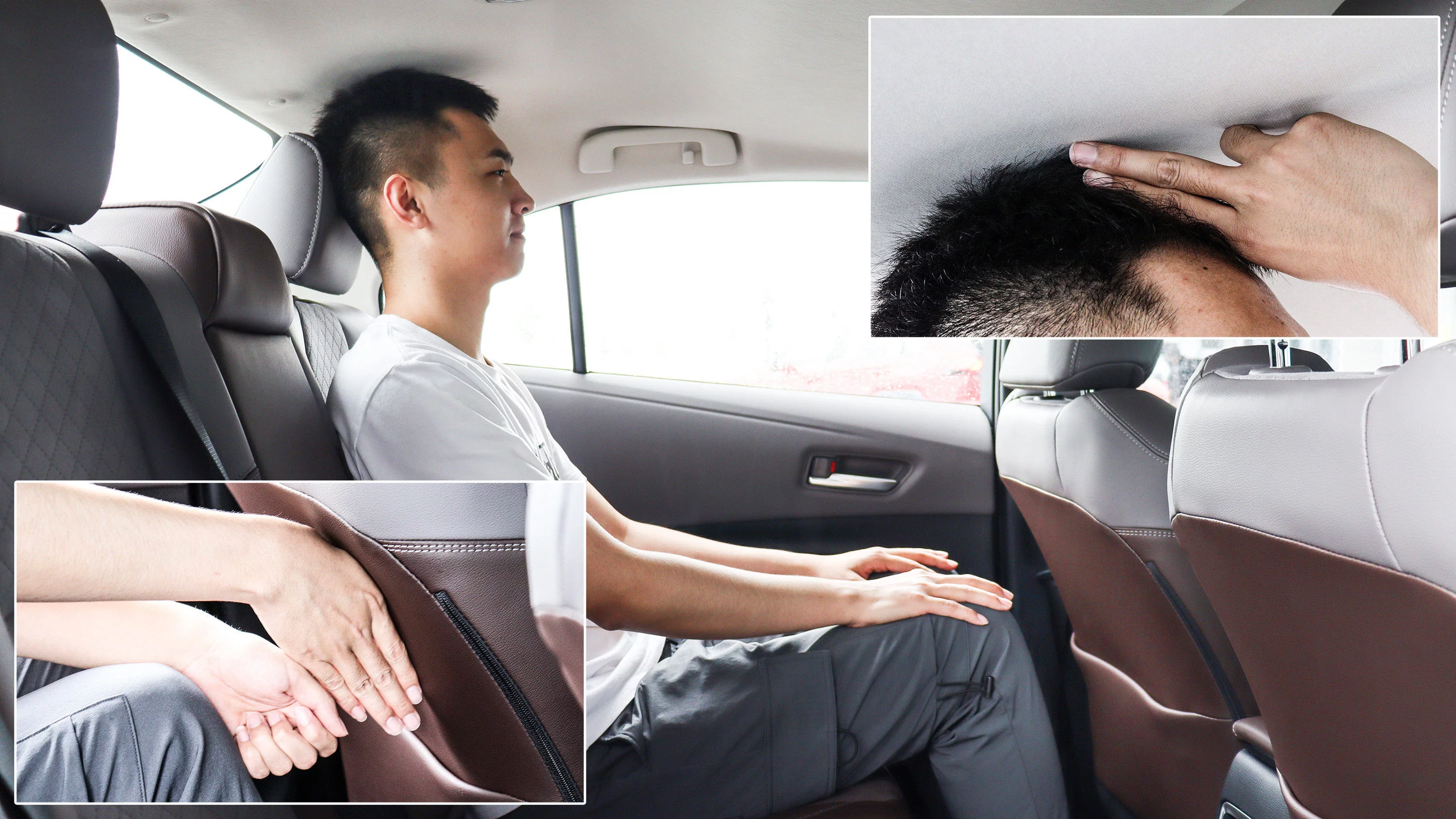此时,保持前排座椅位置不变,我坐在后排的腿部空间还有1拳4指,比较宽敞。但是头顶就只剩下2指的余量了,如果发量比较茂盛的话,蹭头发几乎是不可避免的。由此可见,虽说亚洲狮的腿部空间不错,但是头顶空间还是略显局促,坐在后排总是会觉得头顶有些压抑,不够通透。当然啦,毕竟亚洲狮的腿部空间足够宽敞,即使稍微瘫坐一些也不会顶腿,还能给头部留出更多空间。