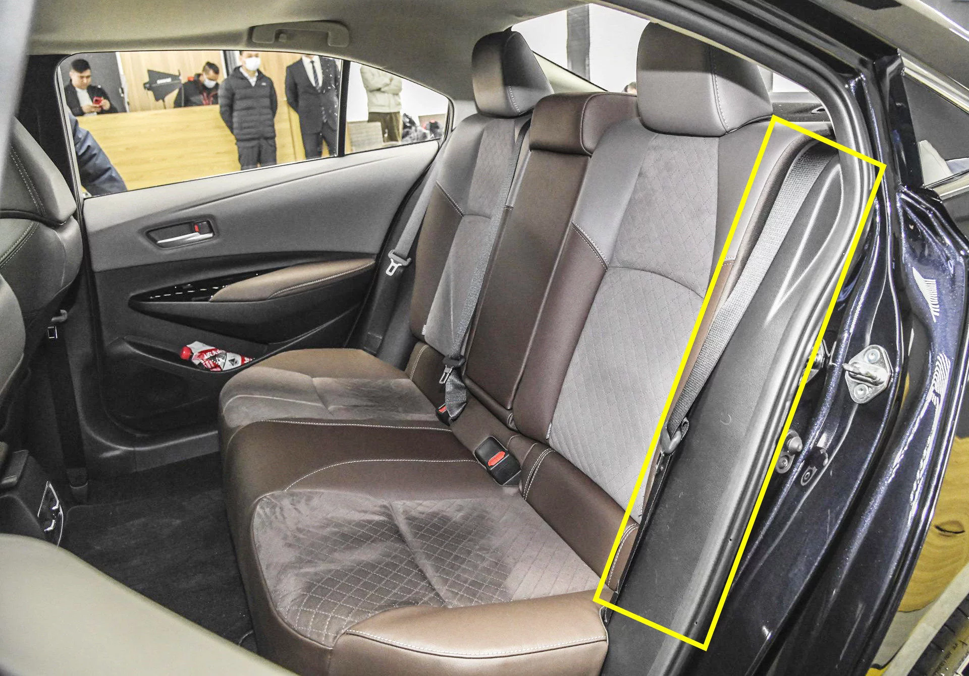 不过,亚洲狮的后排也有一个小小的不足,受限于1780mm的车身宽度,亚洲狮的后排座椅宽度实际上是偏窄的。再加上靠近车门两侧的C柱位置并没有覆盖软性材质,依然是大块的硬塑料(上图黄框内),这就导致后排在乘坐三个人、或者乘客坐姿稍微向车门倾斜一点时,身体便会跟这块硬塑料直接接触,在一定程度上降低乘坐的高级感。