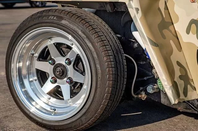 图:常见的Jeep玩家都会用上巨大的轮组,化身成为一台Hot Rod,但是这车主却选用了14寸的SSR Longchamp XR4轮圈,以及小直径的轮胎,直接让车车体降低了。
