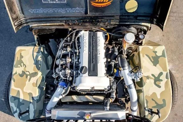 图:打开机舱,一目了然。来自飞鸡的SR20DET发动机塞满了整个机舱,车主表示尽管非常拥挤,但好在无需切割防火墙等或者修改车架。